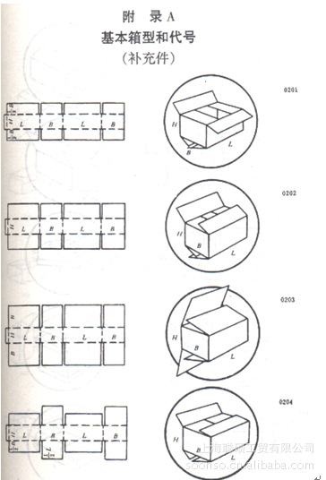 基礎型即基本箱型,在標準中有圖例可查,一般用四位數字表示,前兩位表示箱型種類,後兩位表示同一箱型種類中不同的紙箱式樣。例如:02表示開槽型紙箱;03表示套合型紙箱等。而組合型是基礎型的組合,即由兩種以上的基本箱型所組成,用多組四位數字或代號來表示。例如,一個紙箱的上搖蓋可以用0204型,下搖蓋用0215型。